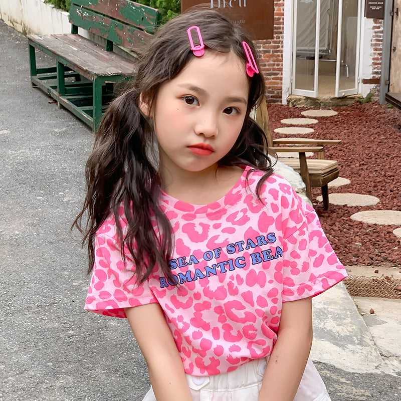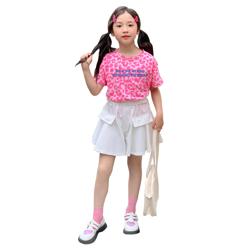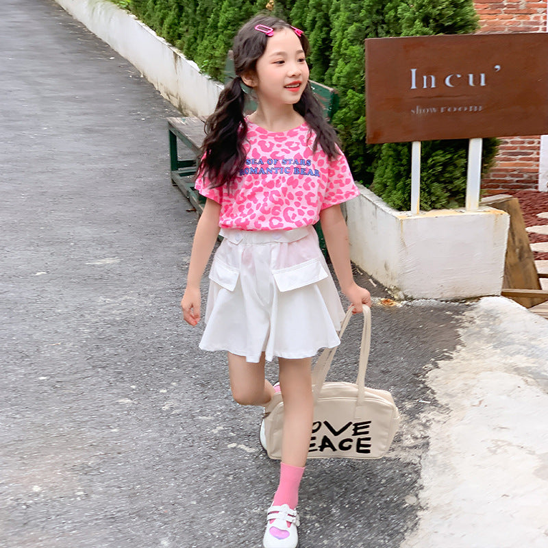 Girls' Korean Style Leopard Print Cotton T-Shirt + White Skorts Set