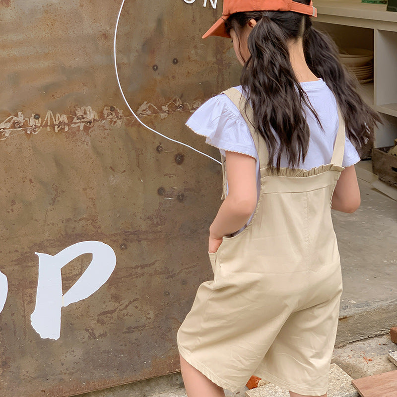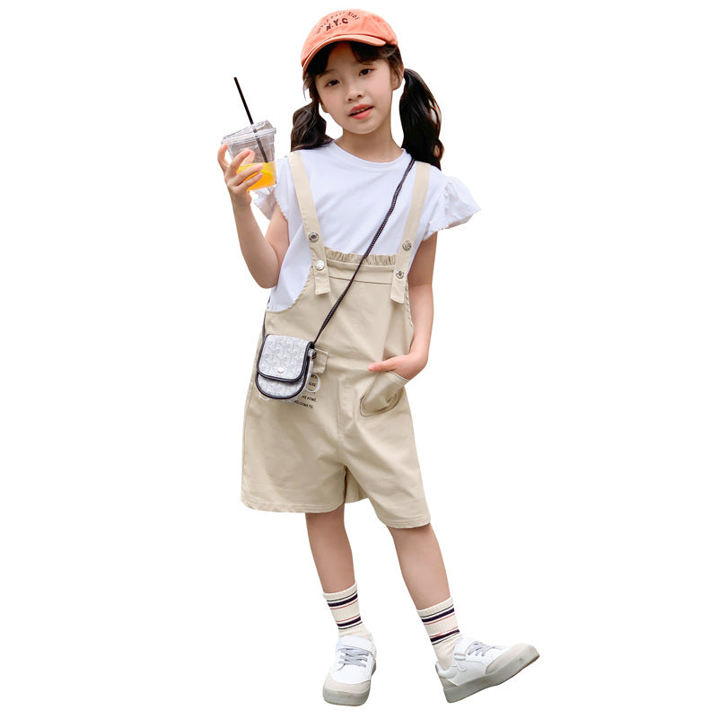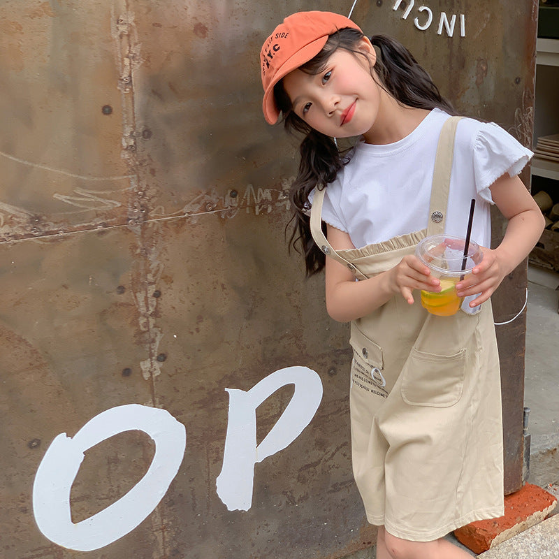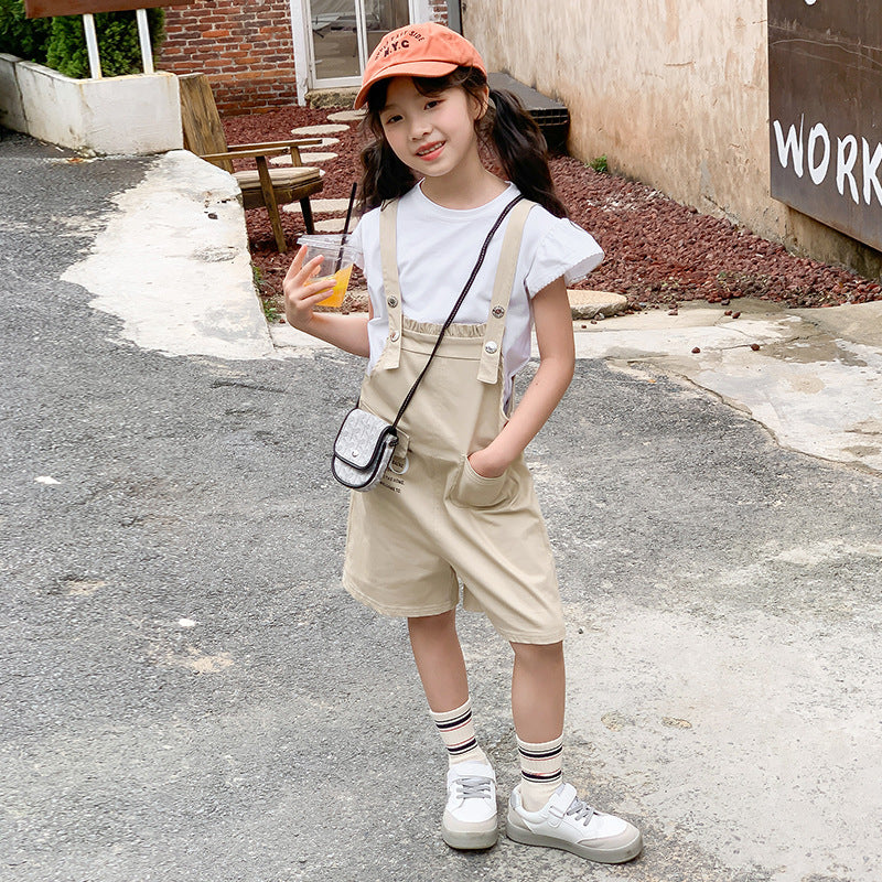 Girls' Korean Style Suspenders Straight Shorts + Flare Sleeve T-Shirt Set
