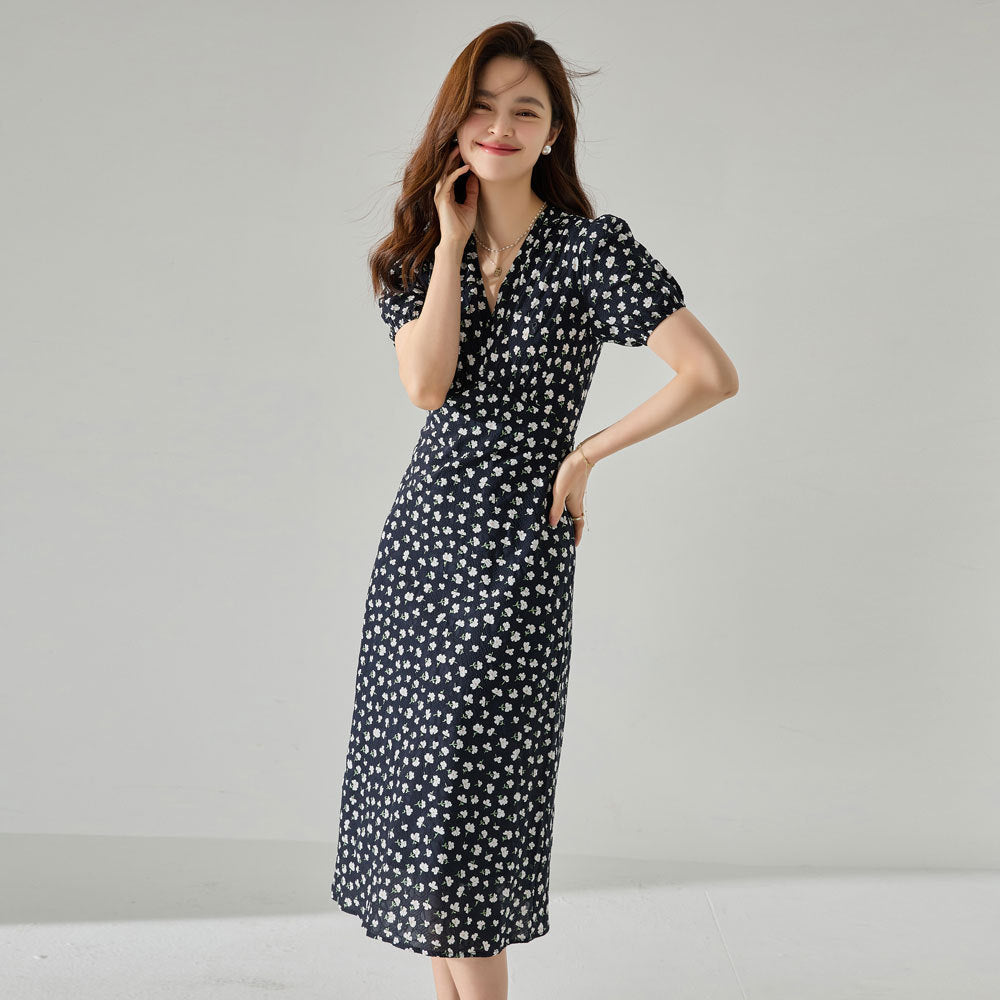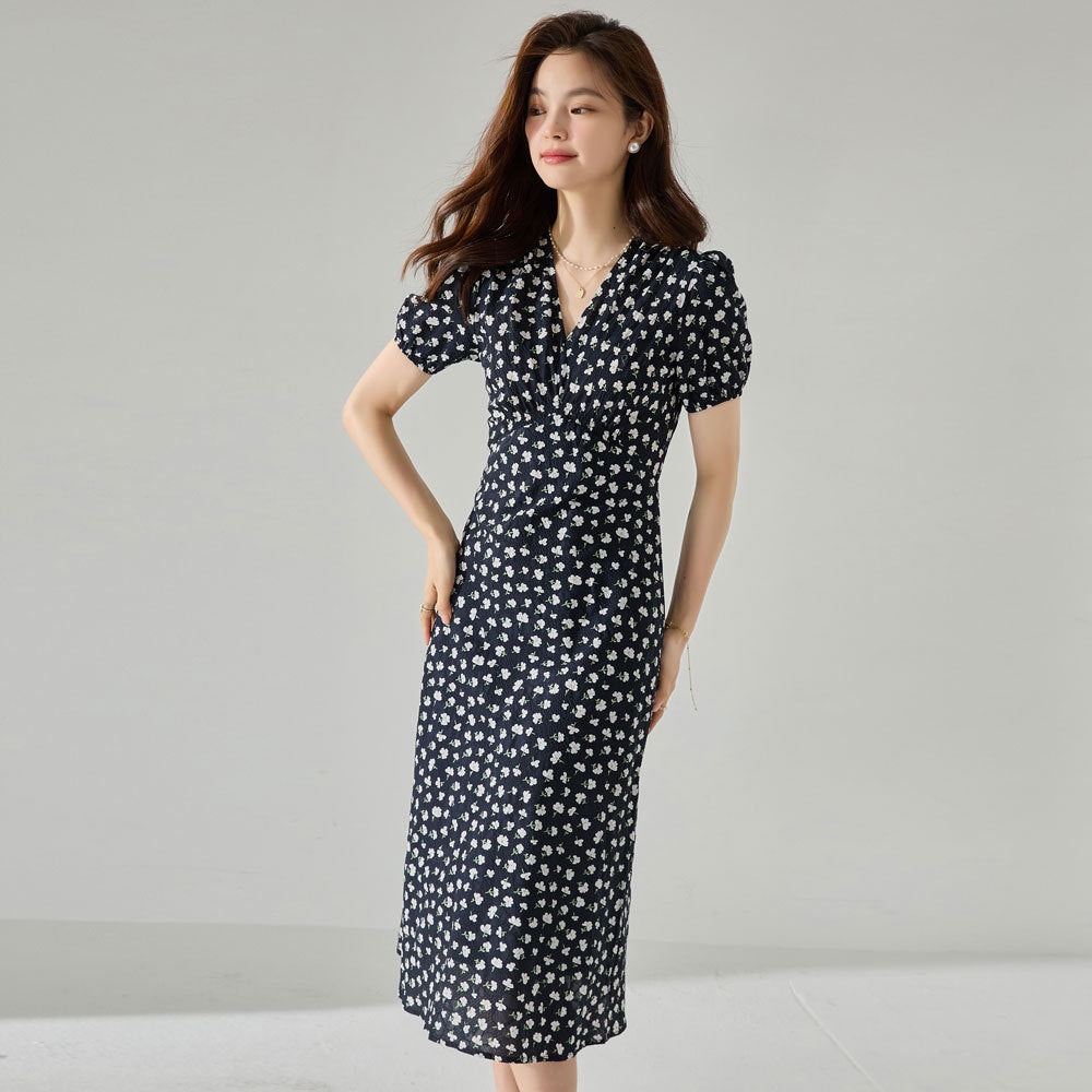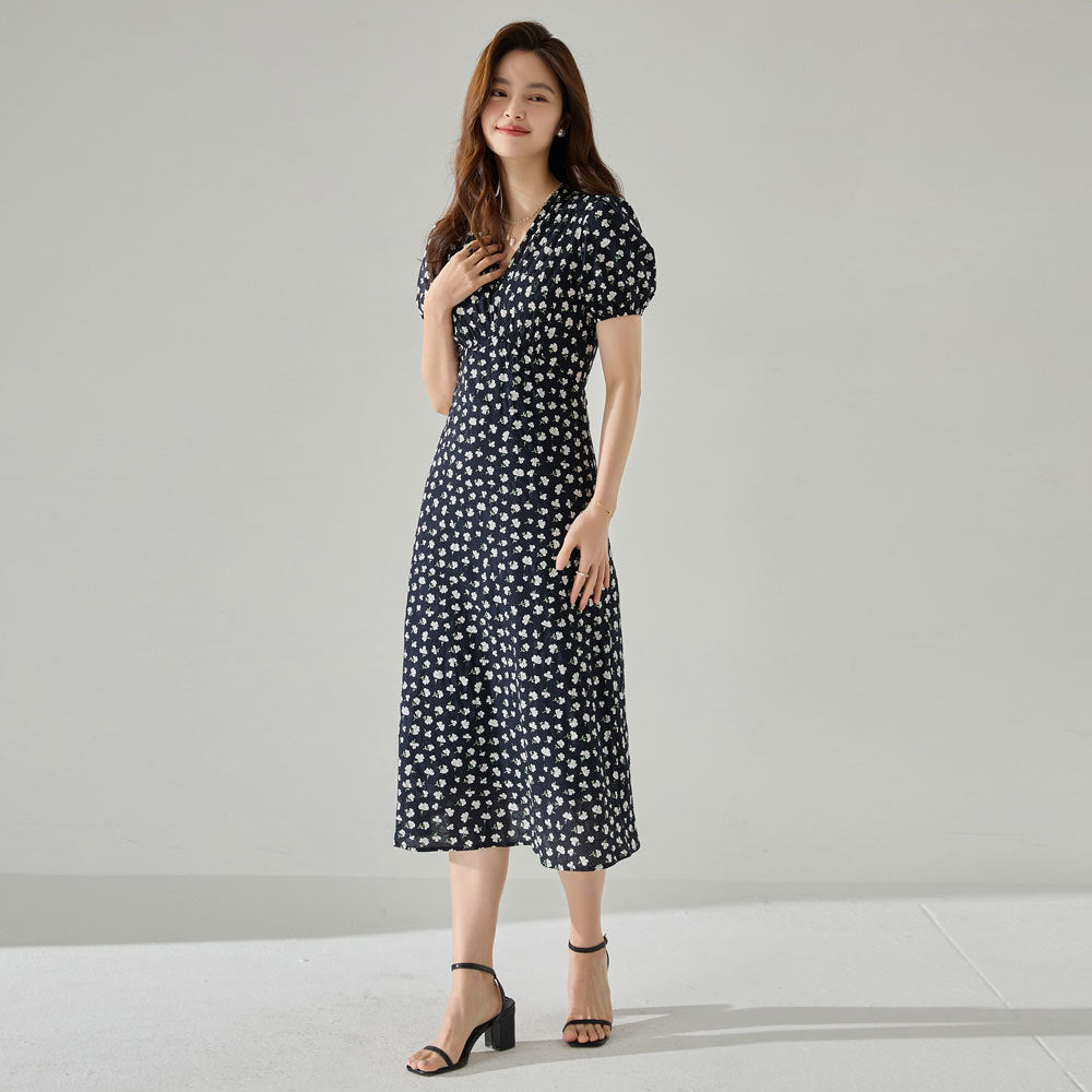 Introducing the Retro Floral Ruched Midi Dress, where classic style meets modern elegance. This dress is crafted from a lightweight fabric adorned with a charming black floral print, ideal for seamless transitions from day to night. The ruched waist not only enhances your silhouette but also ensures a comfortable fit, making it perfect for lengthy wear. Whether you're headed to a coffee date or an evening event, this midi dress, with its subtle puff sleeves and v-neckline, offers a timeless appeal that's hard to resist. Pair it with minimalist accessories and your favorite heels to complete the look.