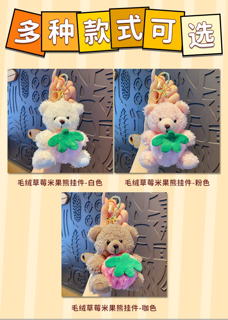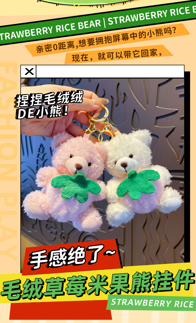 Sweeten your style with the Cartoon Strawberry Rice Fruit Bear Keychain! This plush, soft bear keychain is a perfect accessory for bags, backpacks, or as a cute gift for women.