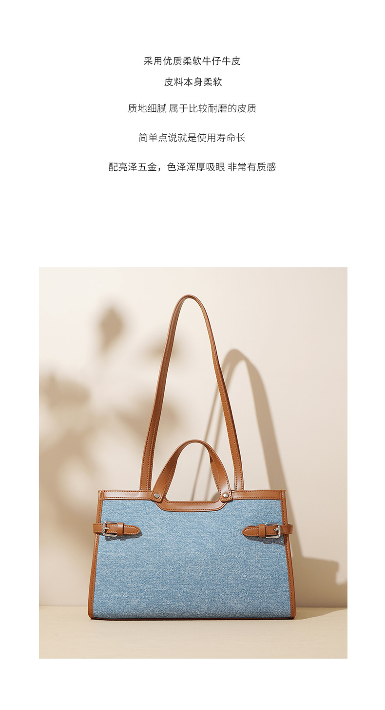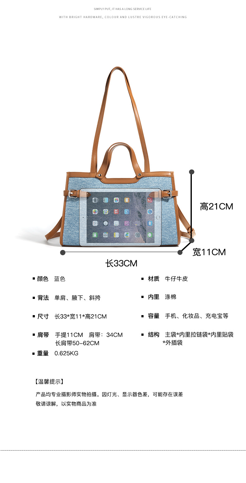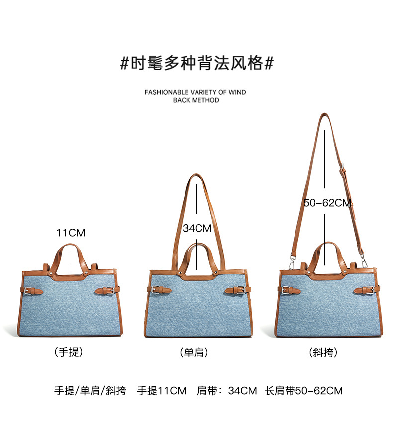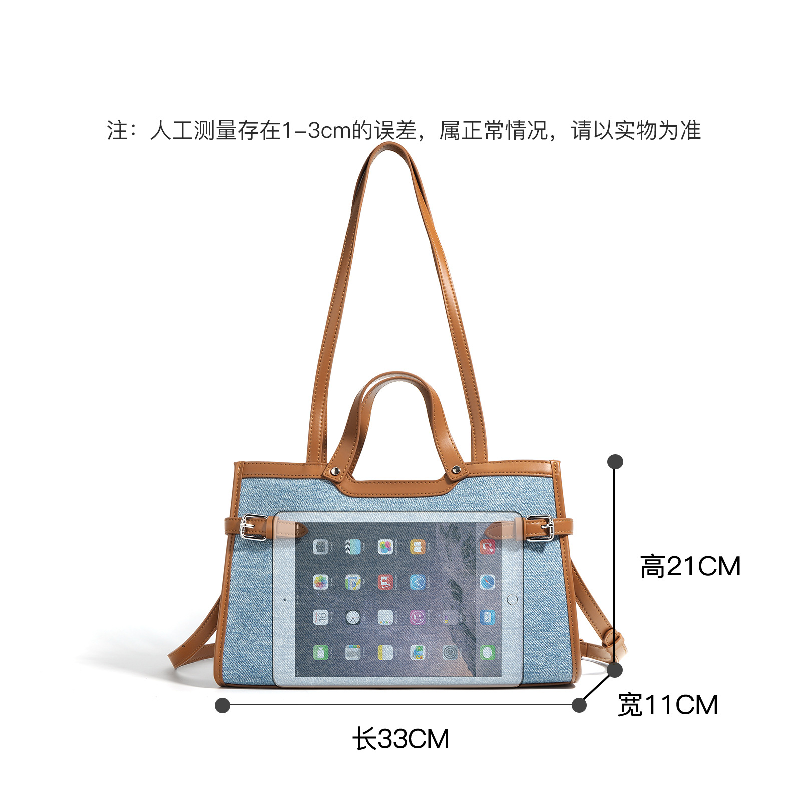 A stylish fusion of denim and genuine leather, this underarm tote offers large capacity and versatile styling. Perfect for commuting, travel, or daily errands.