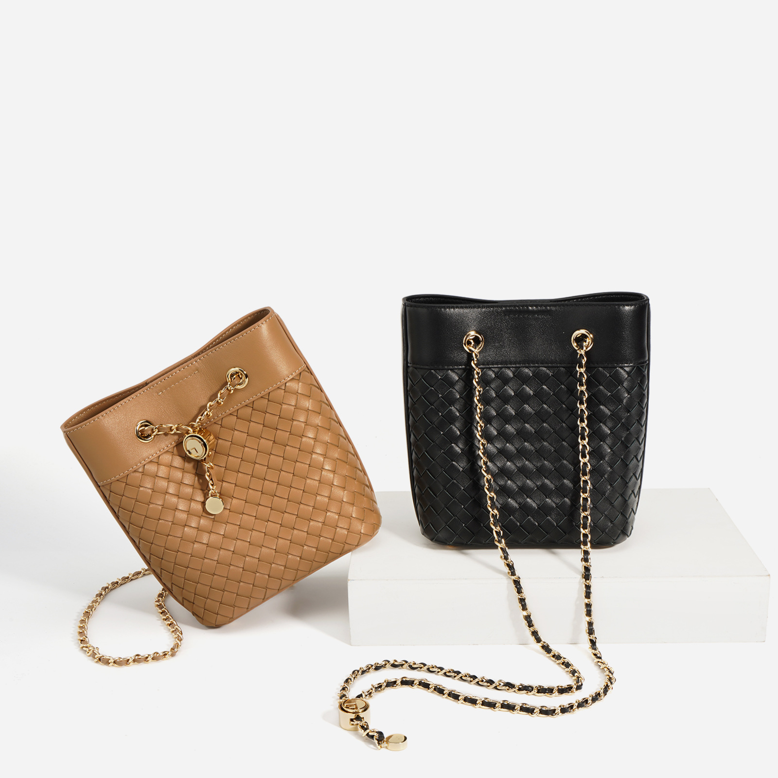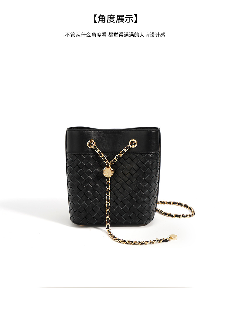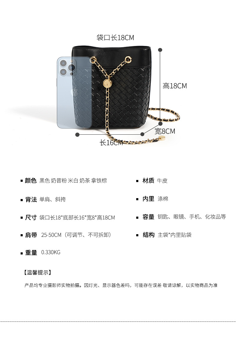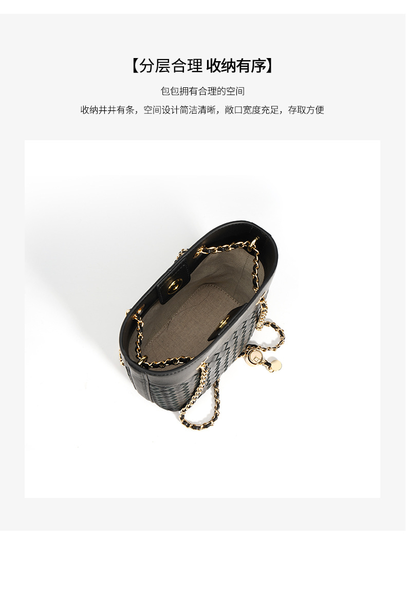 A chic and compact design, this mini genuine leather bucket bag features a small golden ball chain and versatile styling. Perfect for casual outings or evening events.