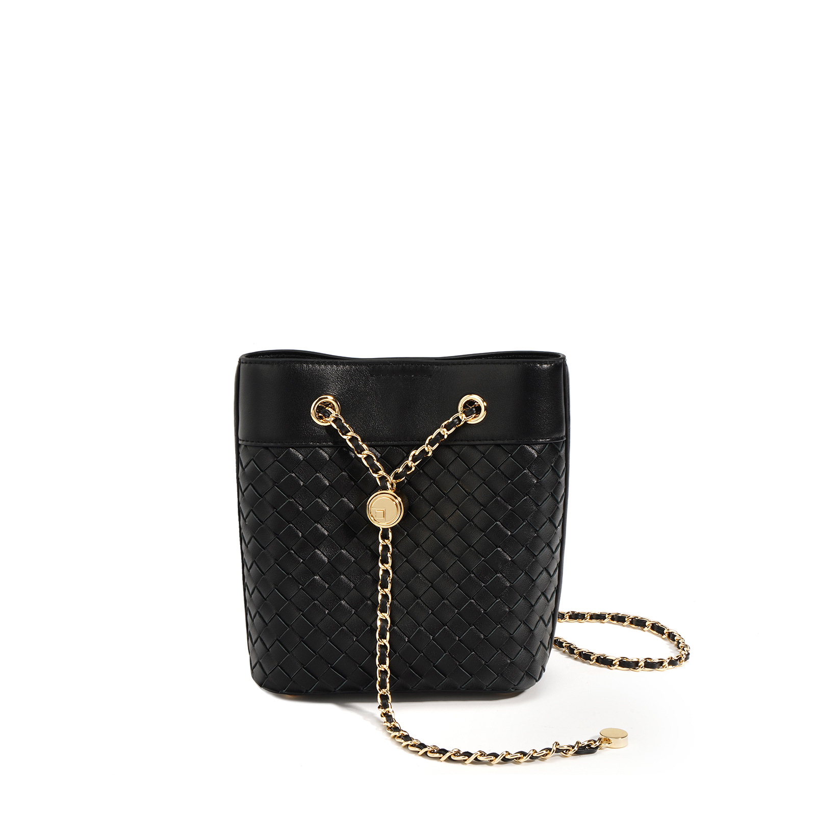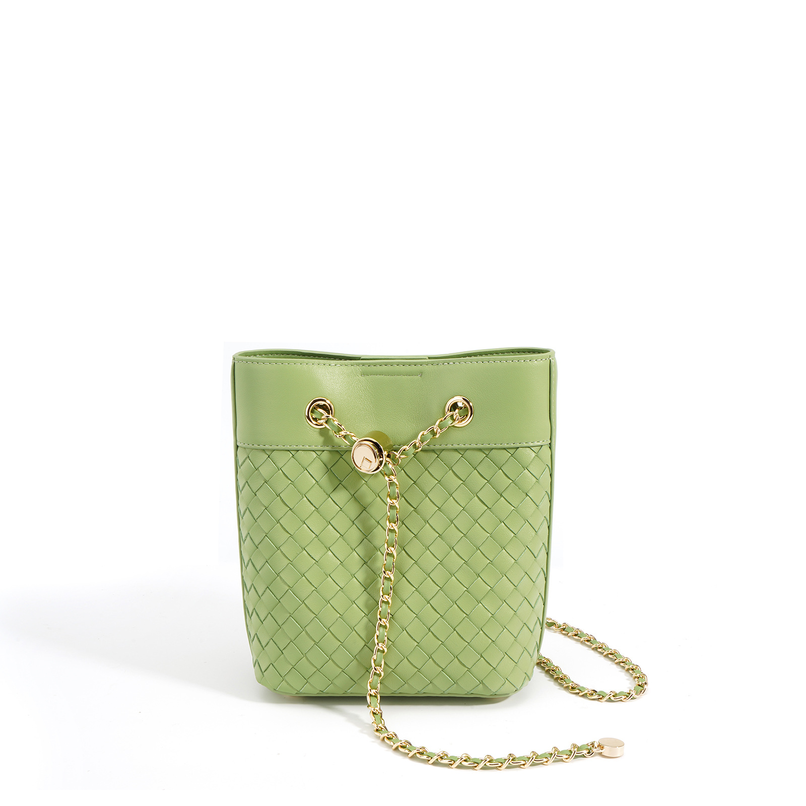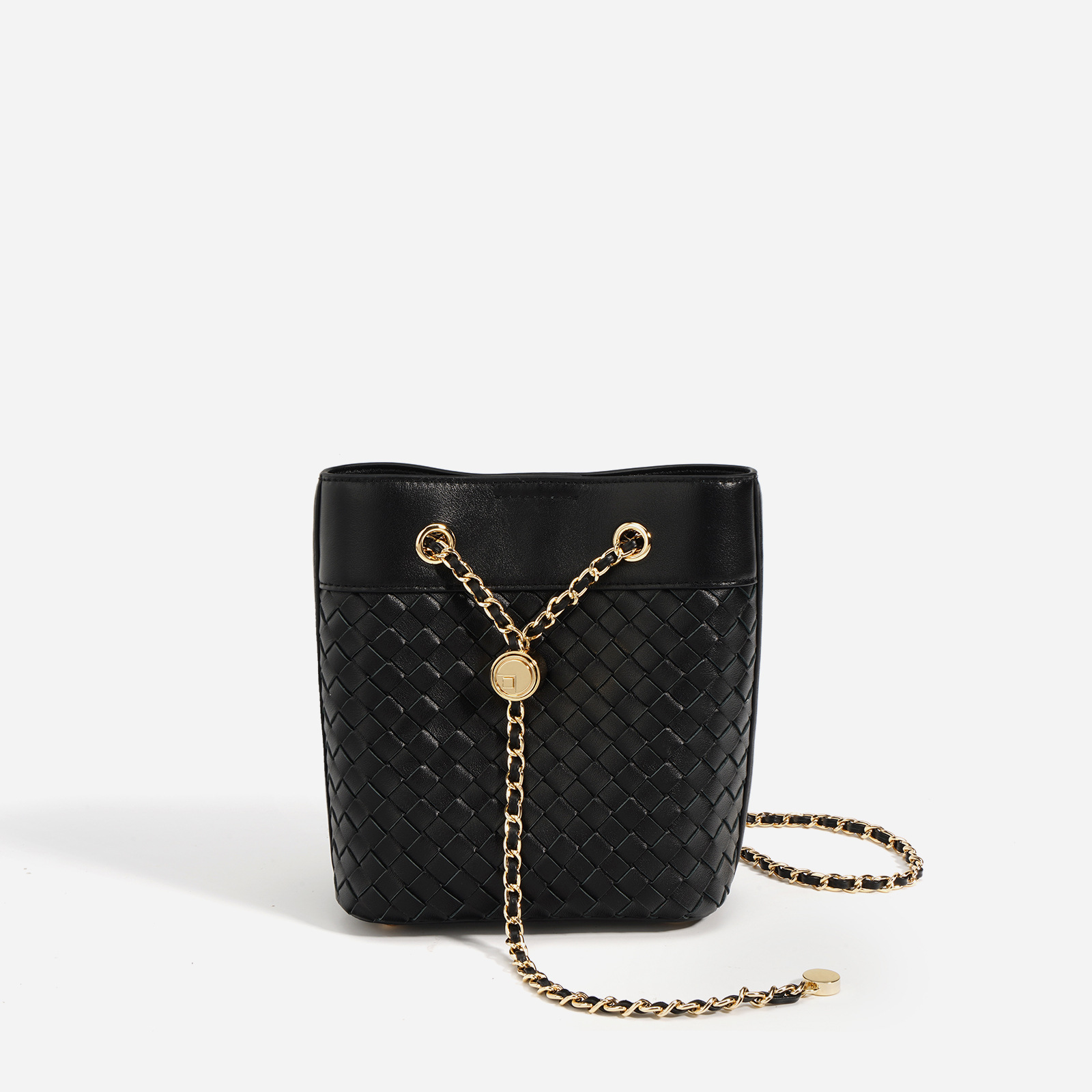 A chic and compact design, this mini genuine leather bucket bag features a small golden ball chain and versatile styling. Perfect for casual outings or evening events.