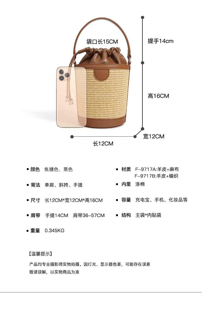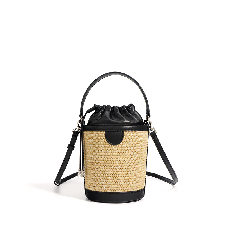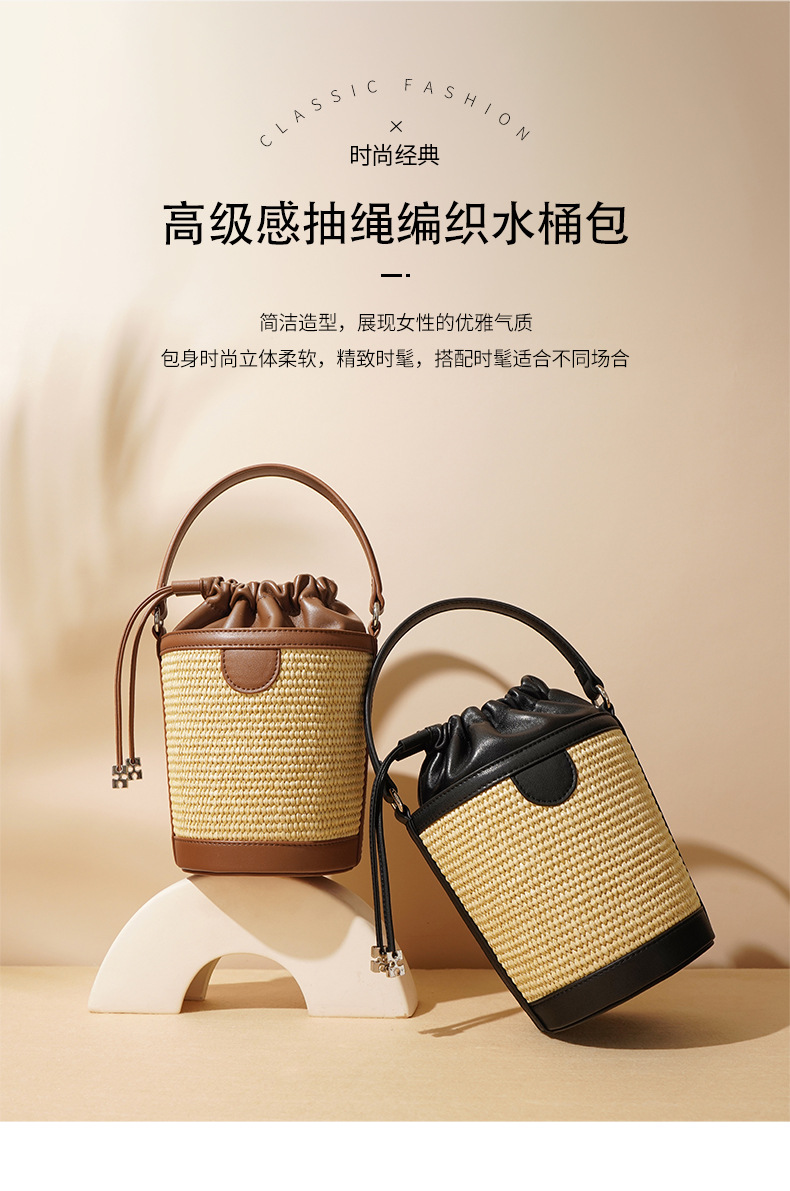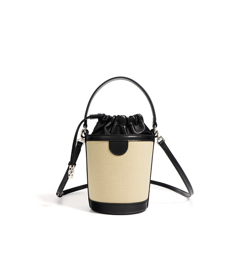 Korean-Style Genuine Leather & Canvas Bucket Bag