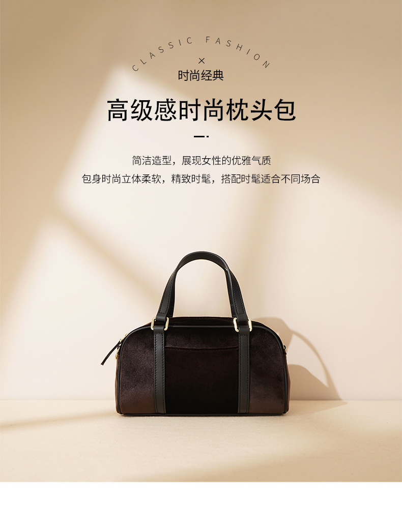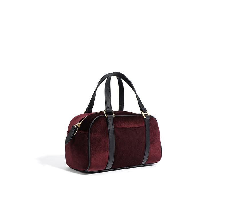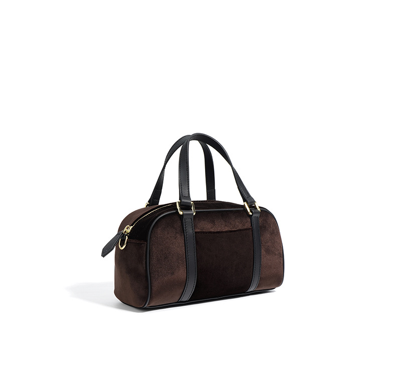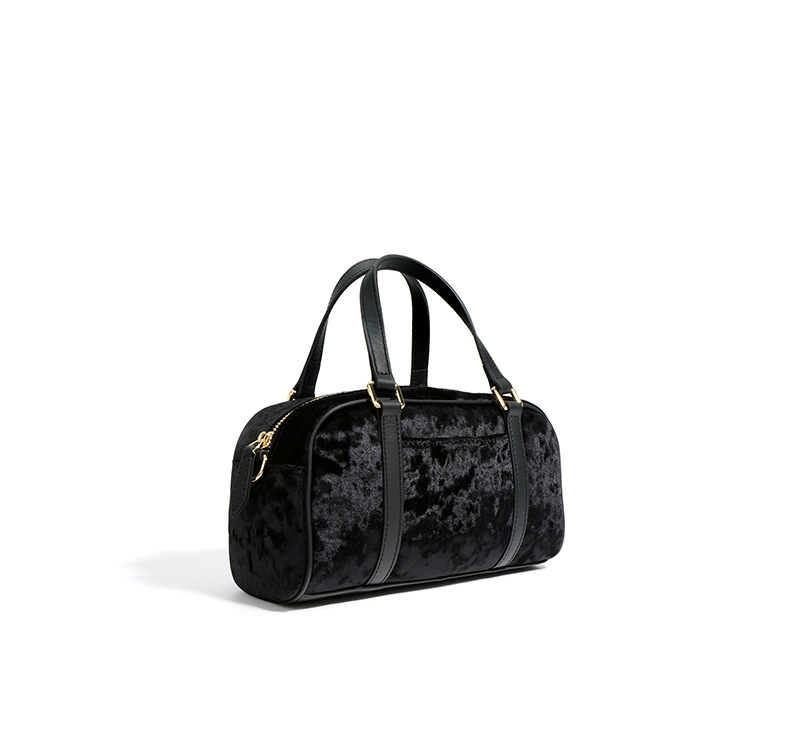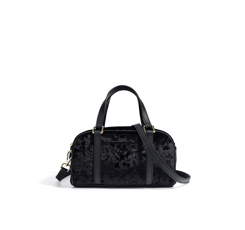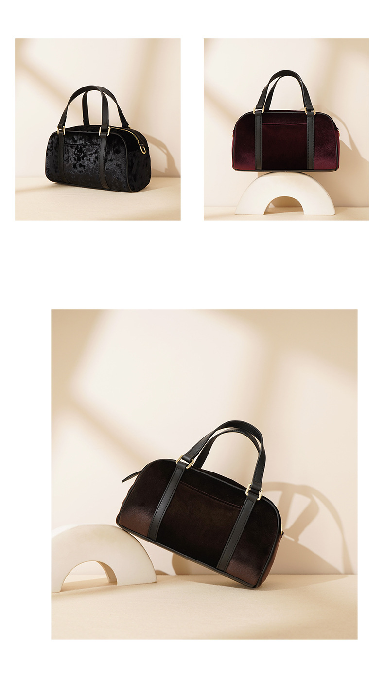 A unique blend of luxury and style, this velvet and genuine leather bowling bag features a niche design and high-end craftsmanship. Perfect for casual outings or evening events.